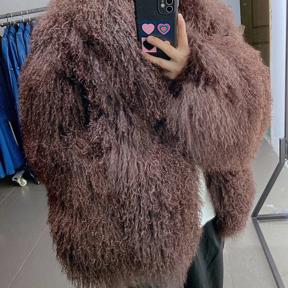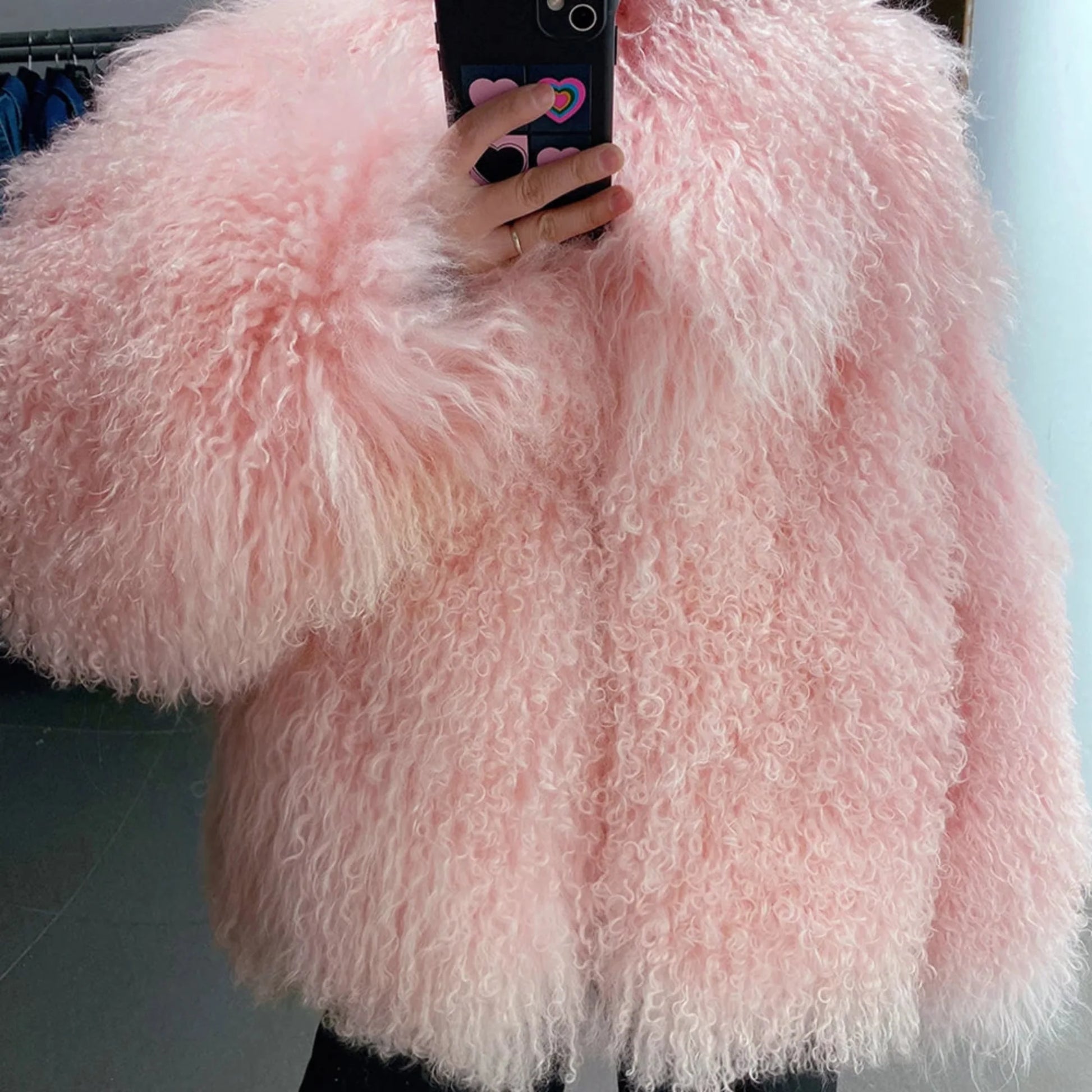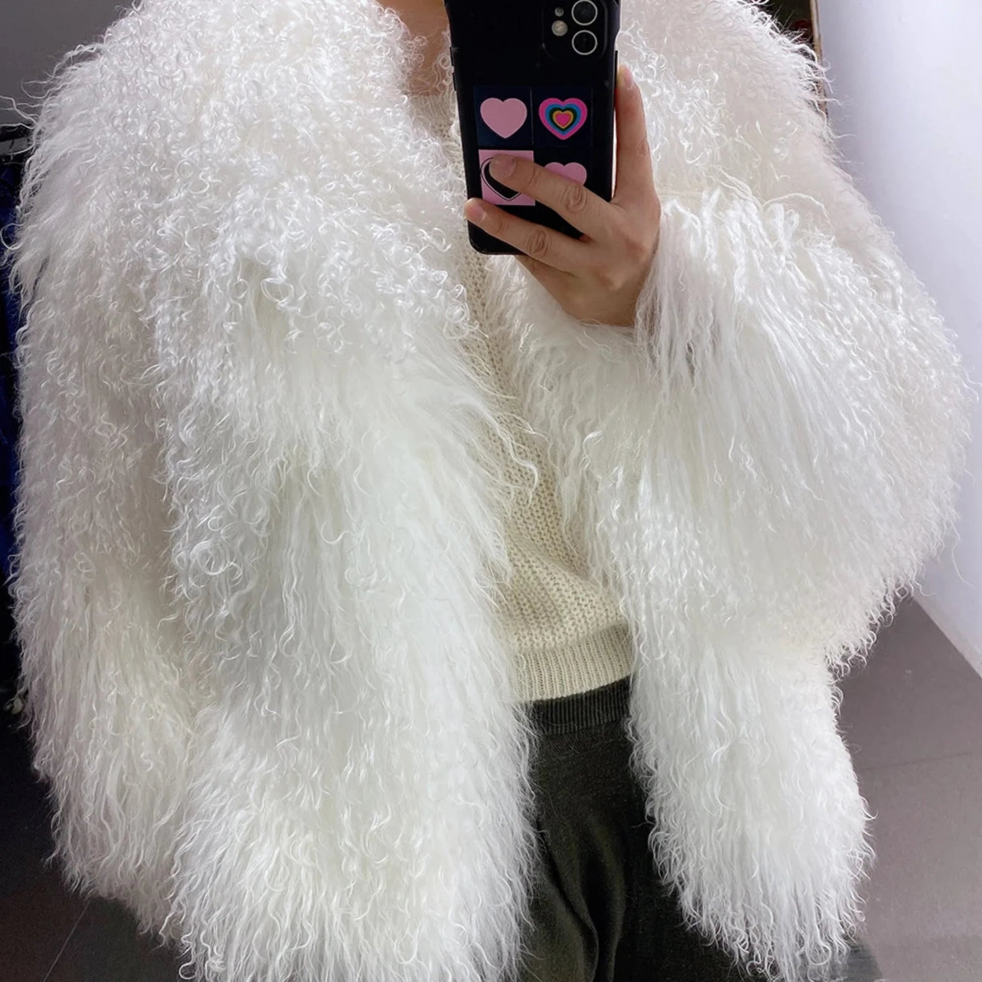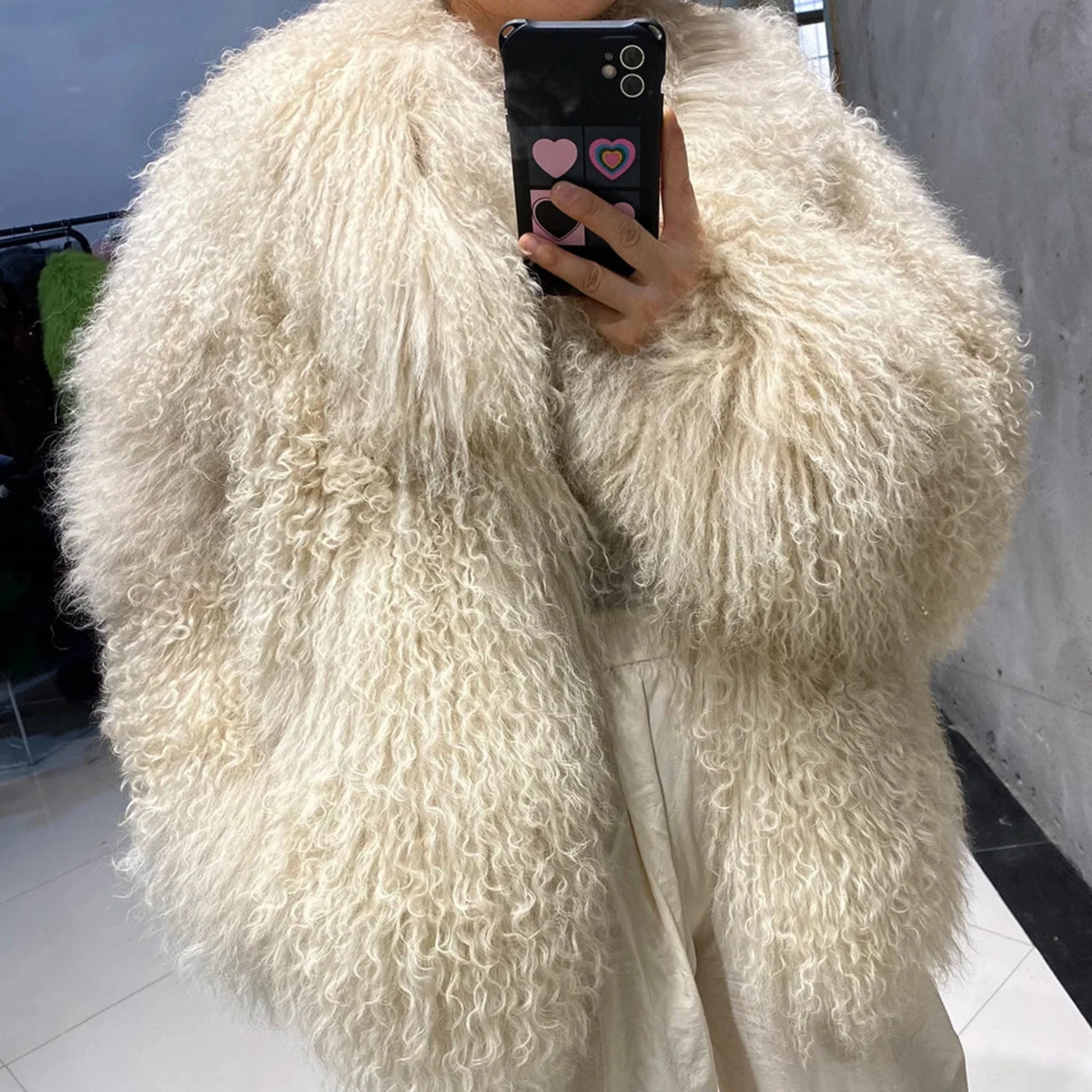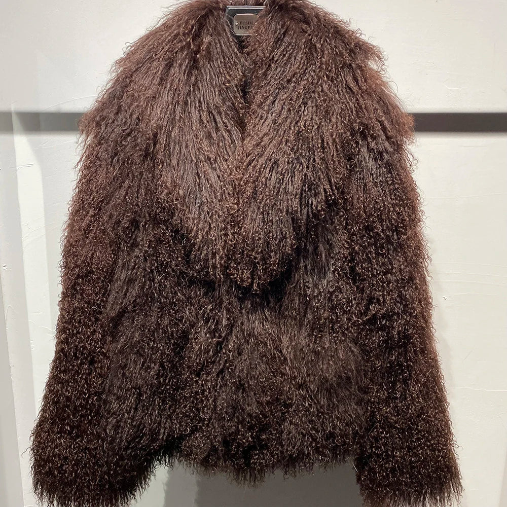 Crafted from 100% real Tibetan Mongolian fur with an extra curly texture. its oversized. plush silhouette wraps you in warmth and refined style. Style Tip: Pair with a sleek dress or tailored jeans for a standout look.