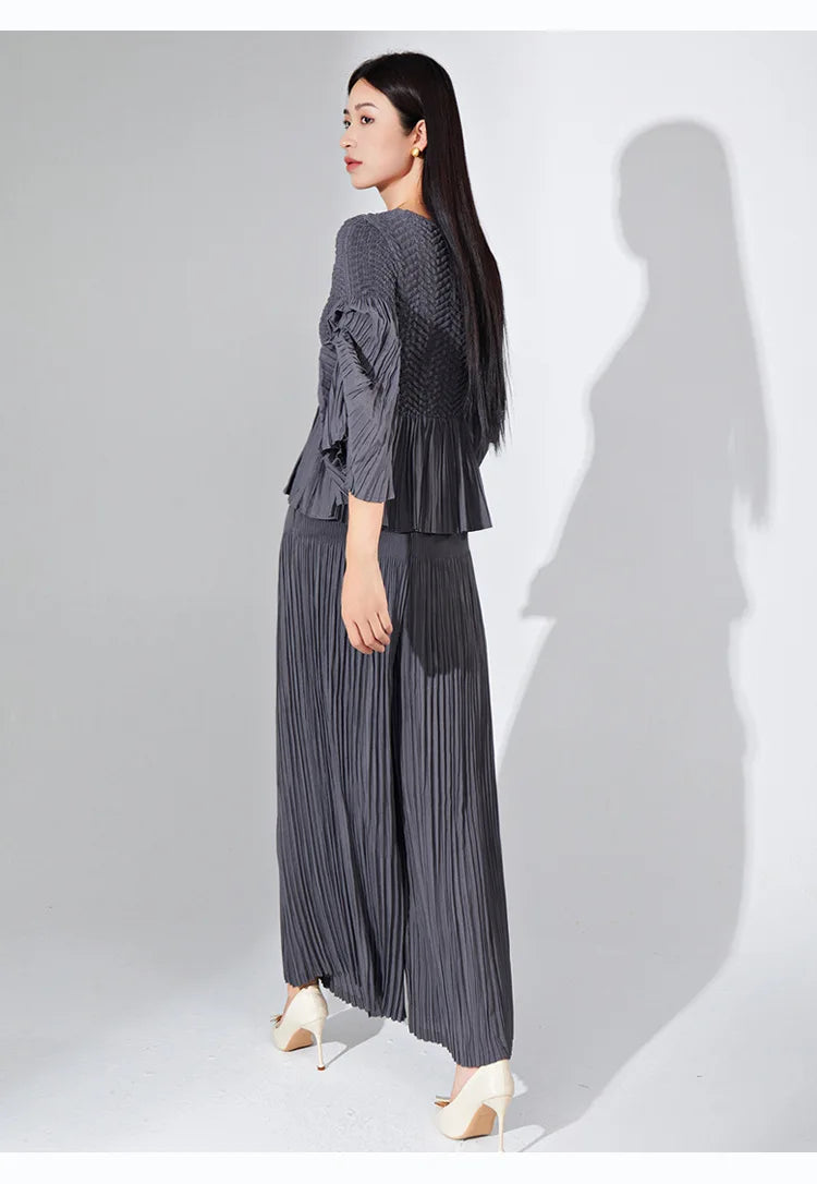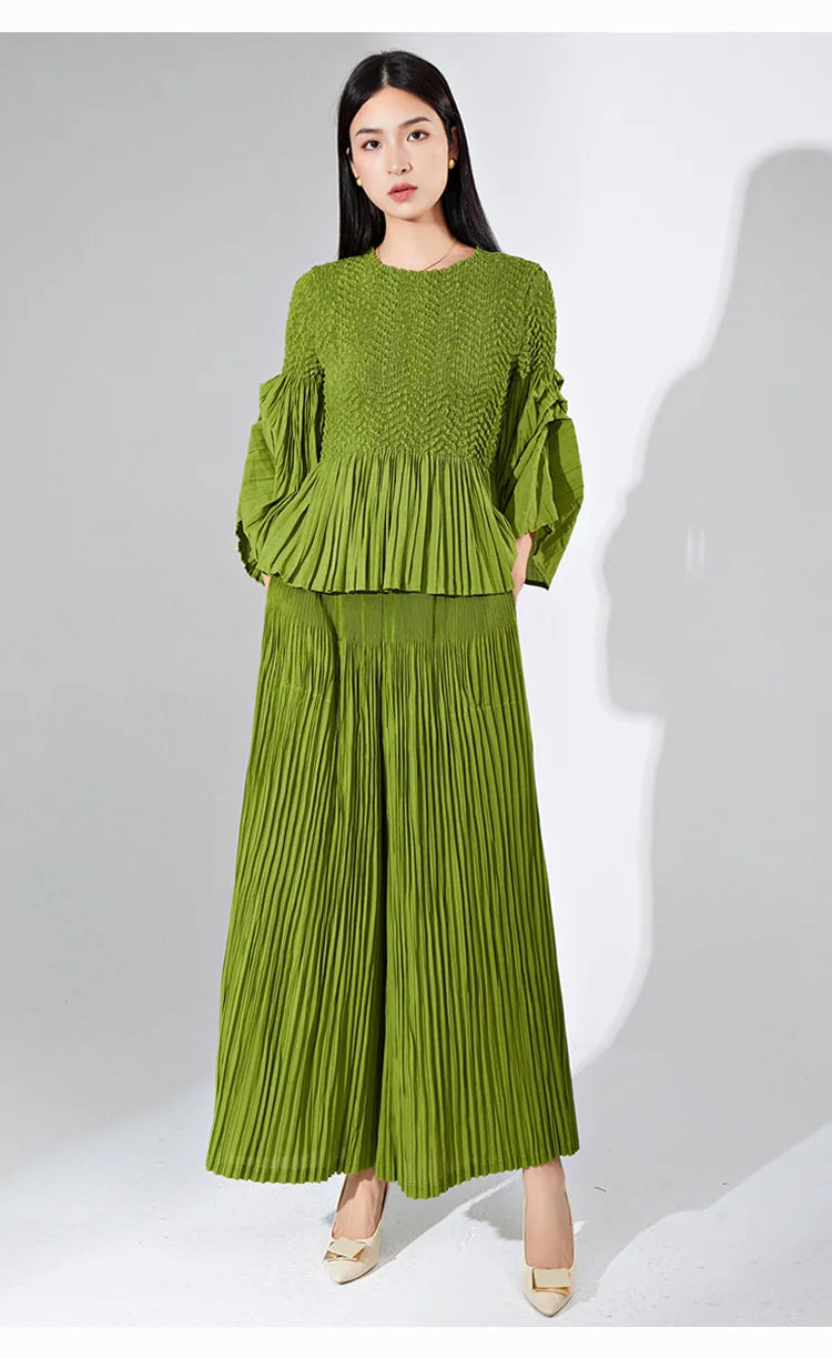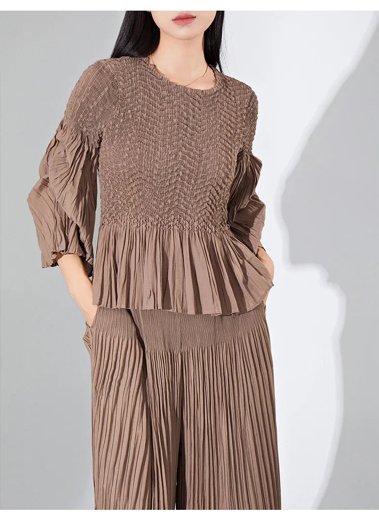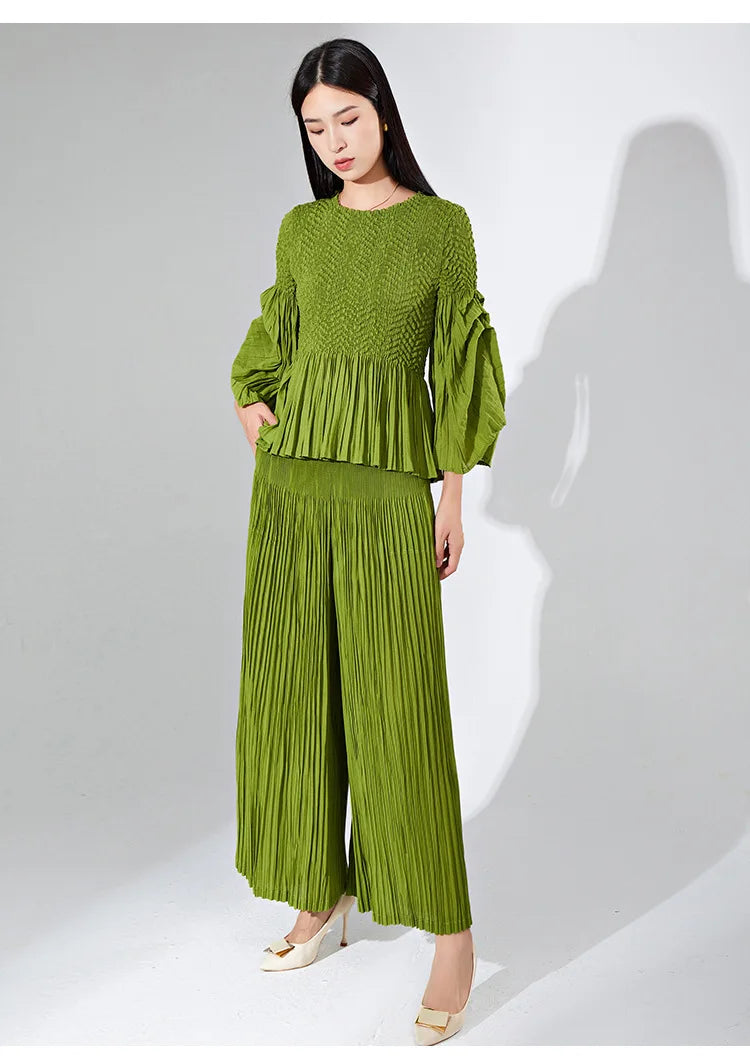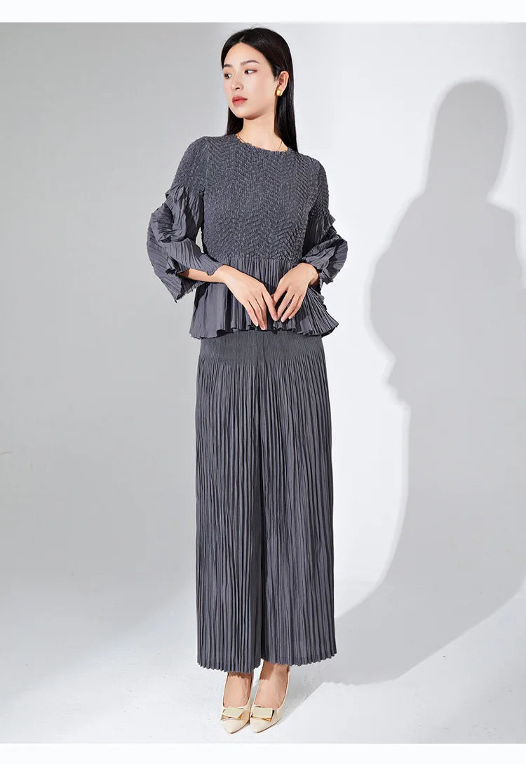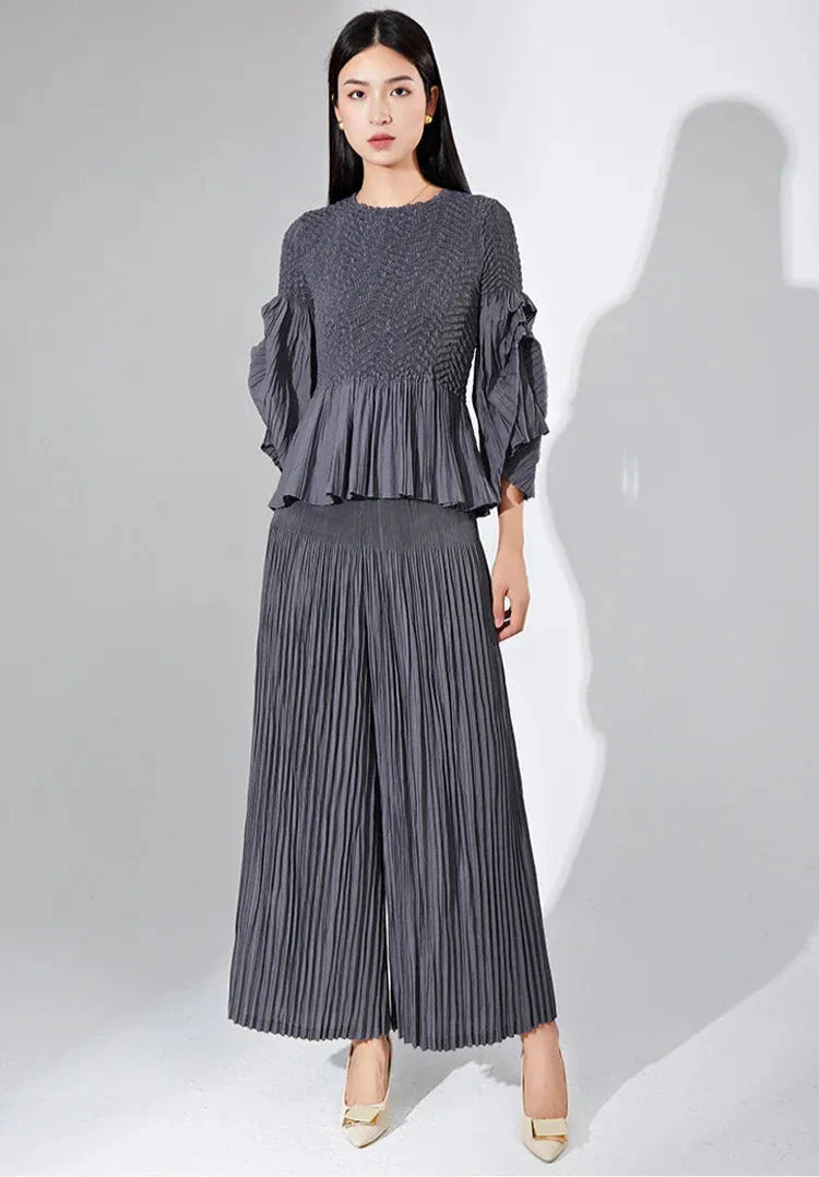 Effortlessly stylish. this 2-piece pleated trousers and top set is perfect for busy women seeking both comfort and sophistication.