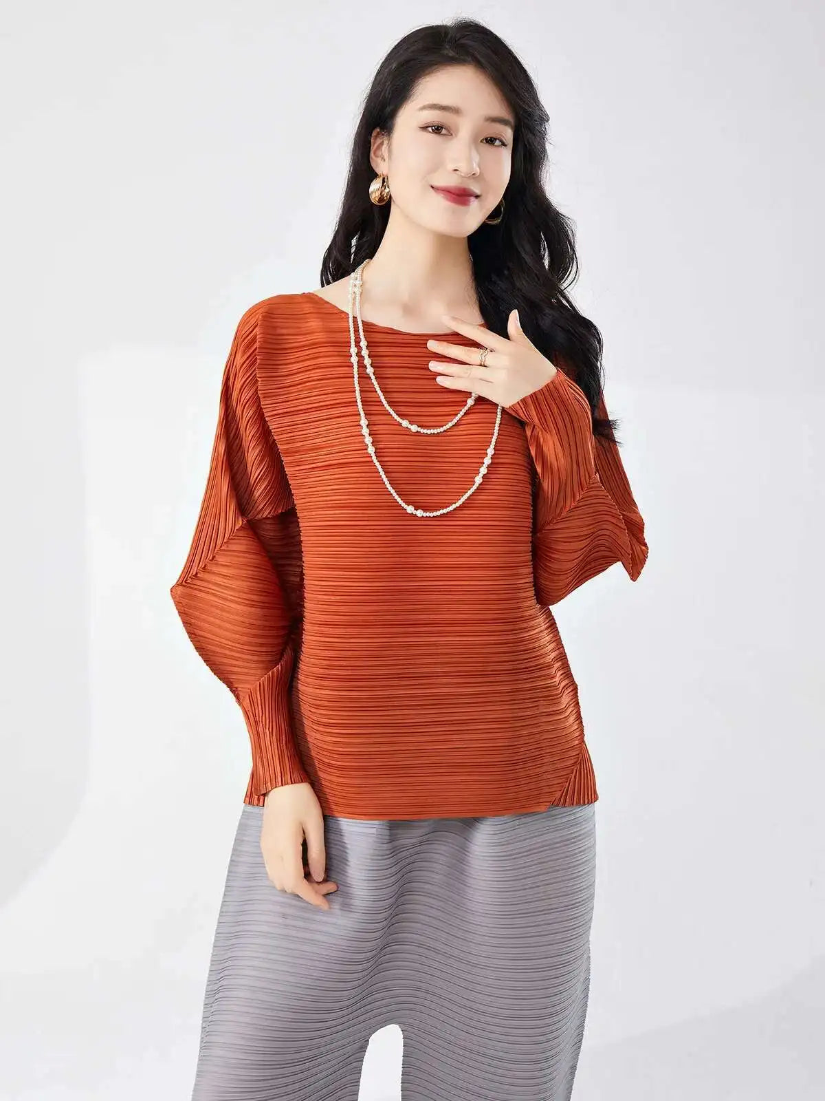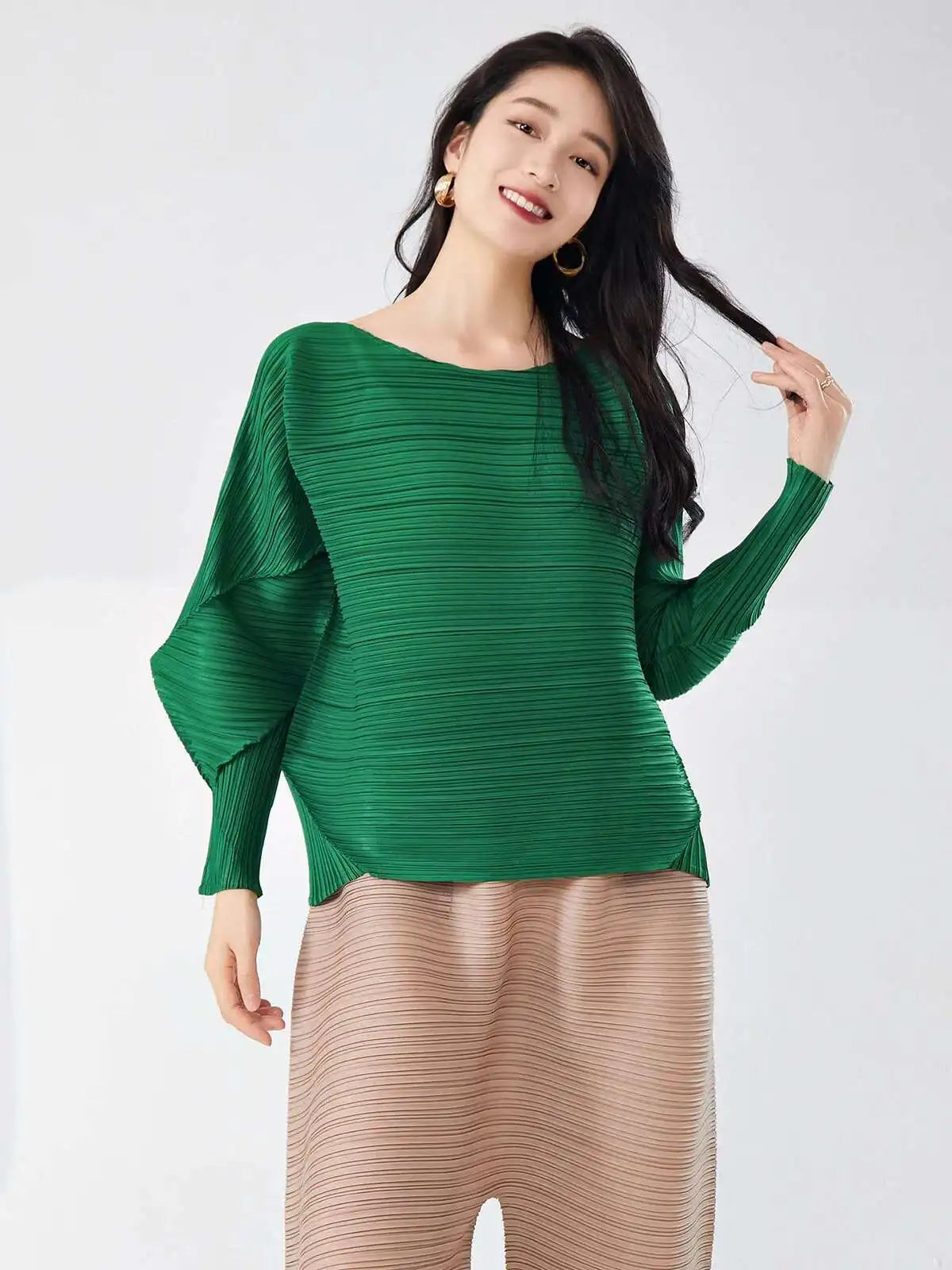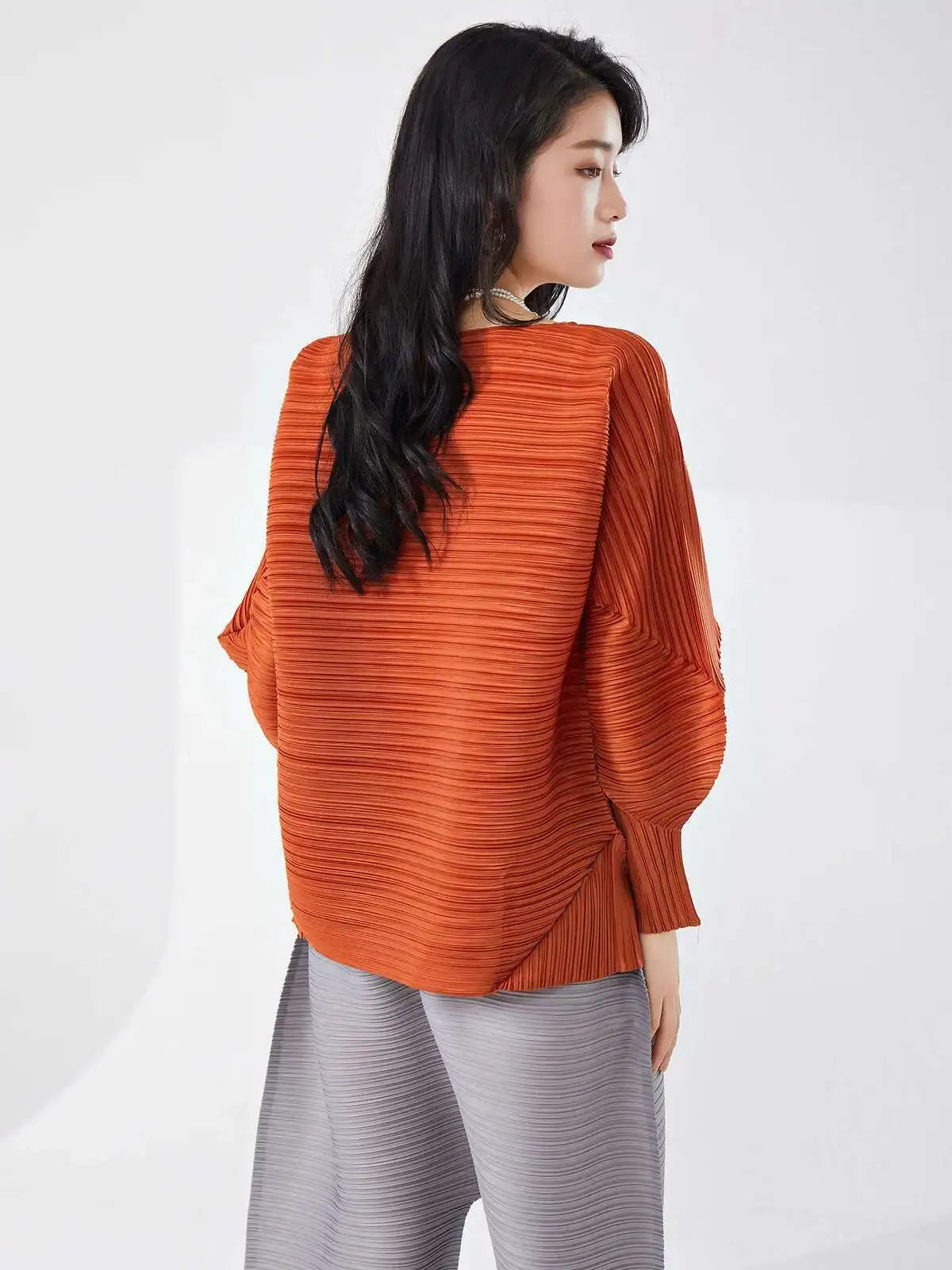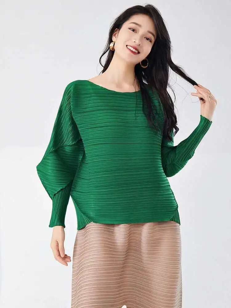 This blouse combines satin with Japanese pleats for a sleek and refined look. The boat neck adds a touch of sophistication. while the relaxed fit ensures comfort throughout the day. Perfect for both casual and more polished occasions.