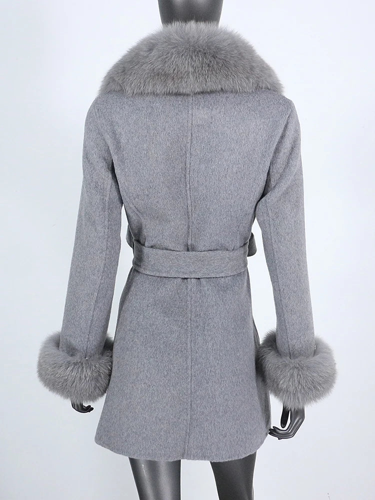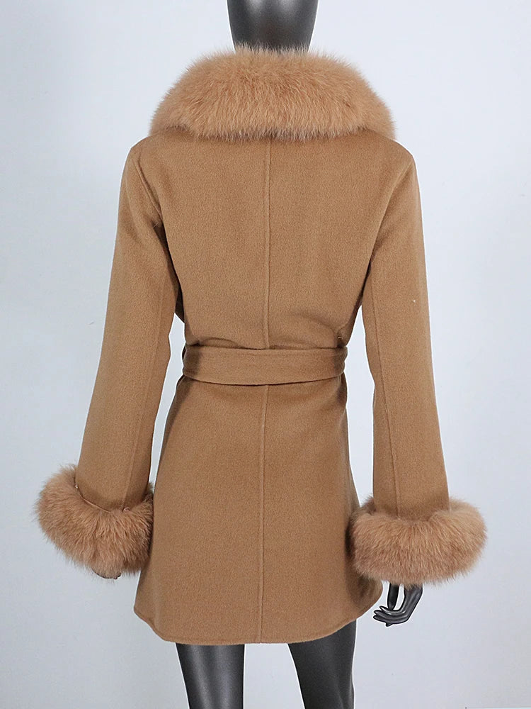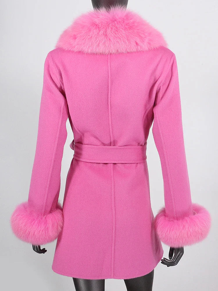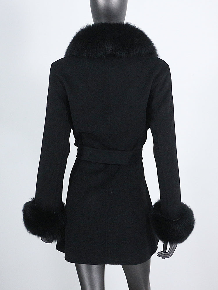 Wrap yourself in pure luxury. This wool and cashmere coat. adorned with a 100% real fox fur collar and cuffs. is the ultimate statement of elegance and warmth.
