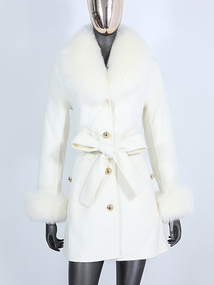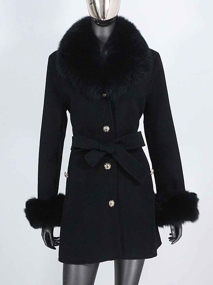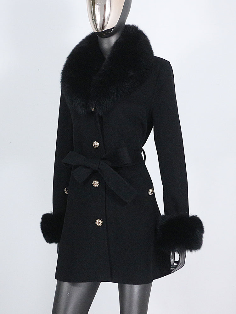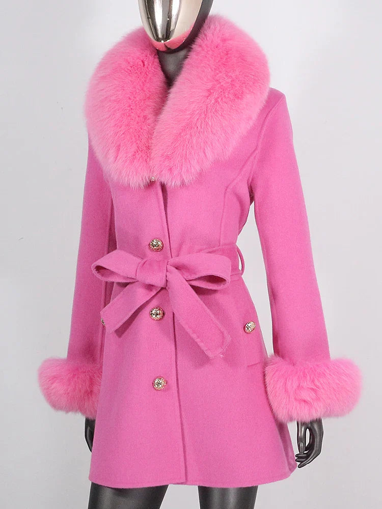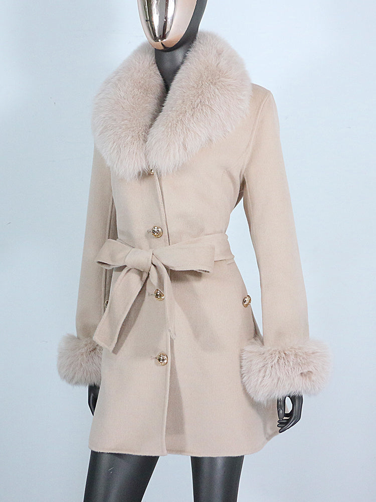 Wrap yourself in pure luxury. This wool and cashmere coat. adorned with a 100% real fox fur collar and cuffs. is the ultimate statement of elegance and warmth.