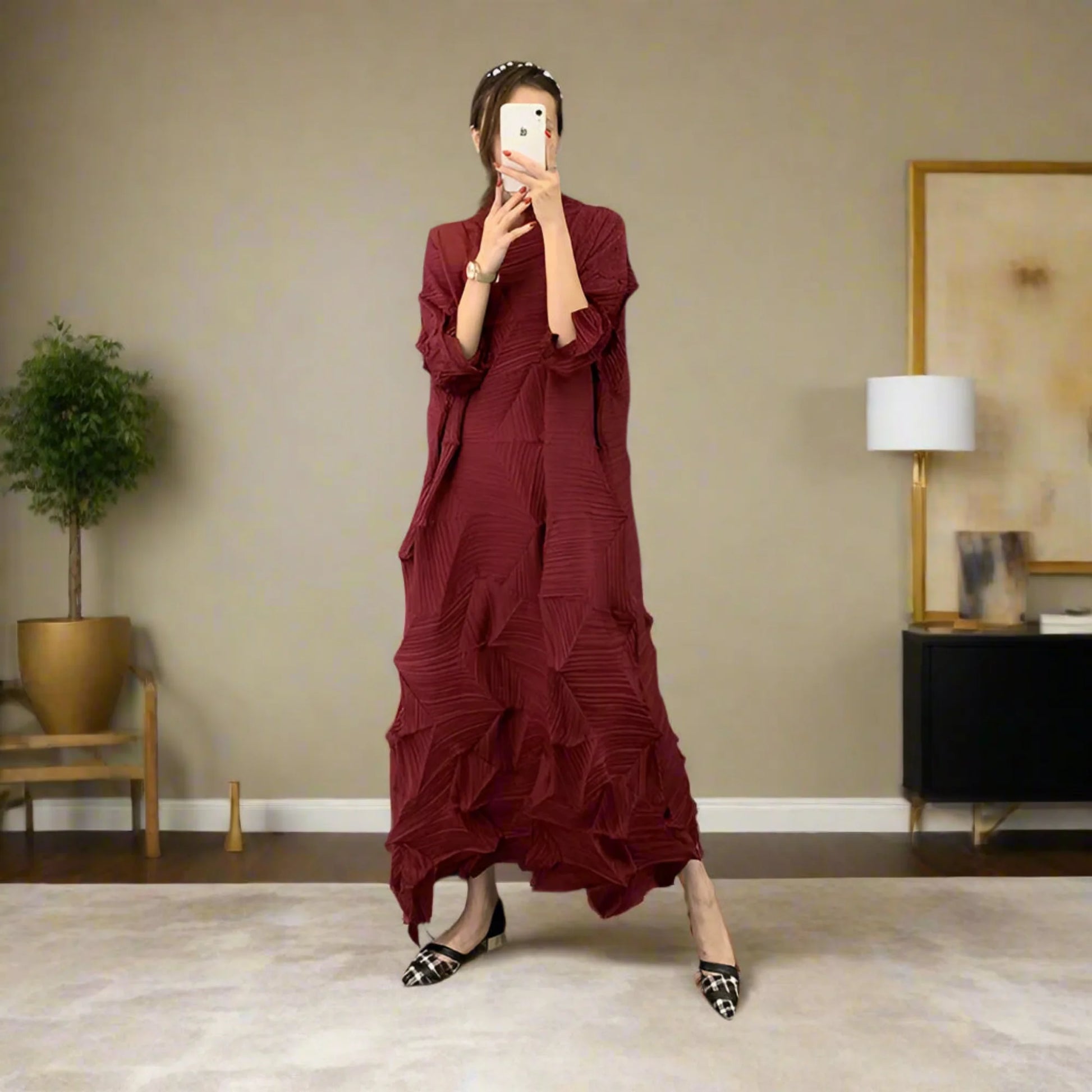 This Signature Origami Midi Pleated Dress combines luxury and style with its 3/4 sleeves and luxe plissé pleats. The oversized fit ensures comfort. while the elegant design adds a touch of sophistication to any occasion. Perfect for those who value both style and comfort.