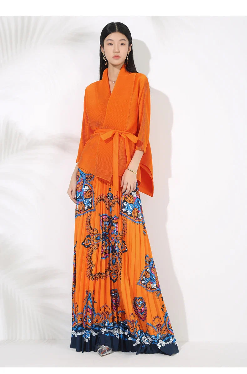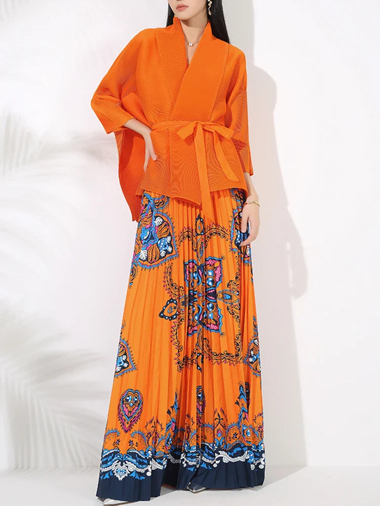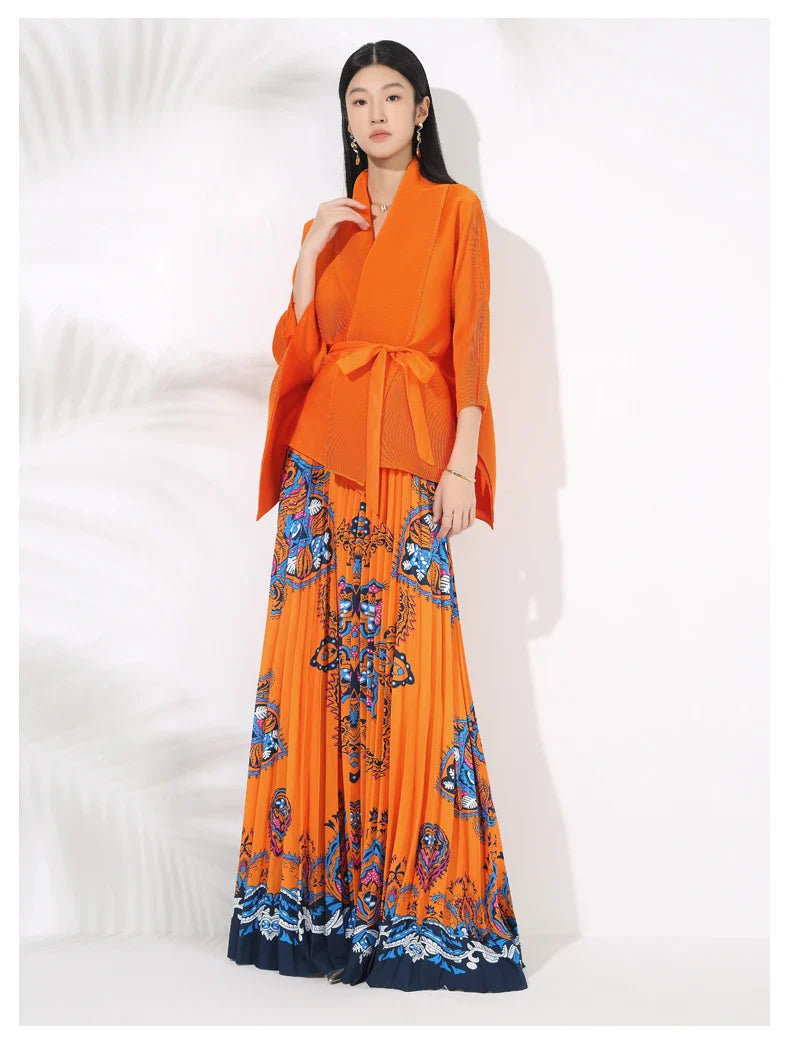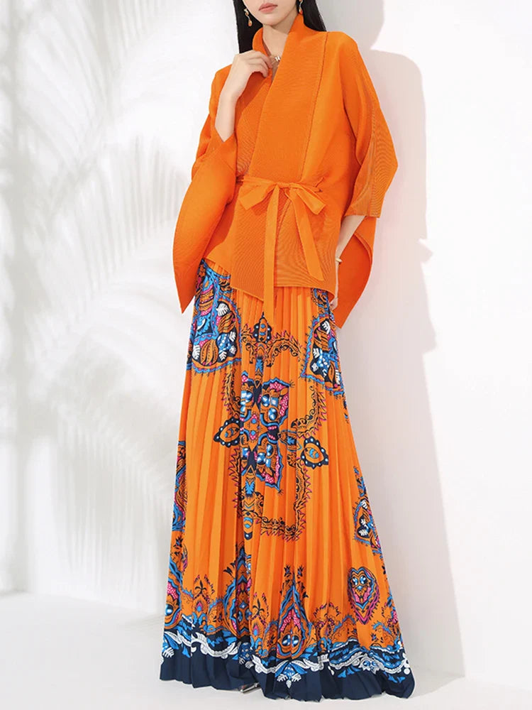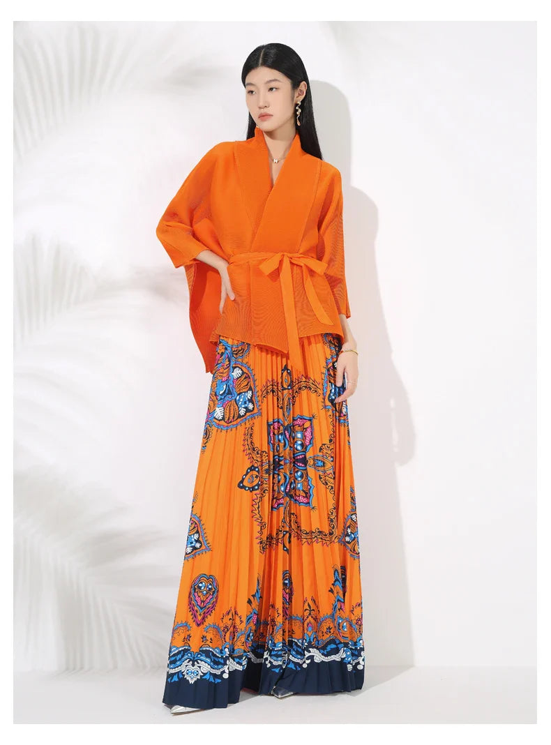 An elegant essential. this pleated set blends sophisticated style with everyday ease. The batwing-sleeve cardigan adds a relaxed yet polished touch. while the maxi skirt. adorned with graceful floral prints. exudes femininity.