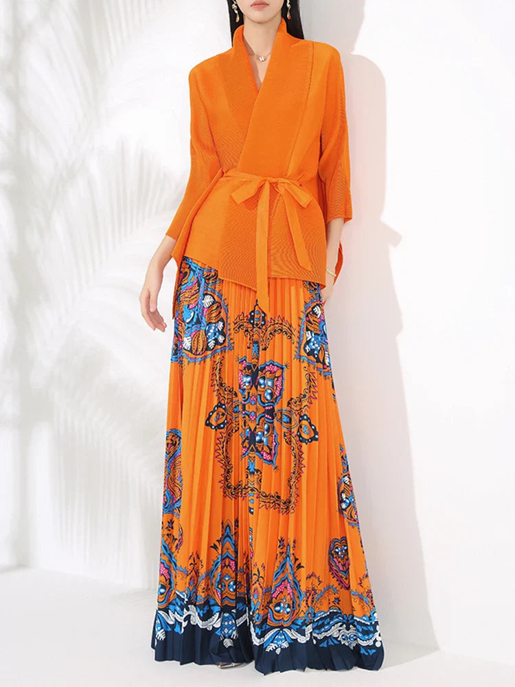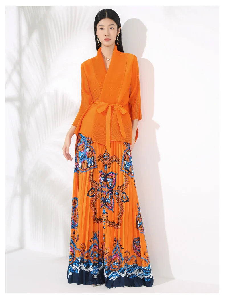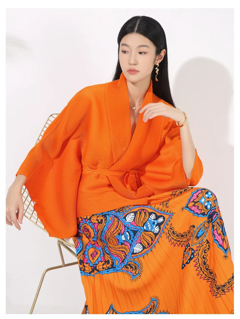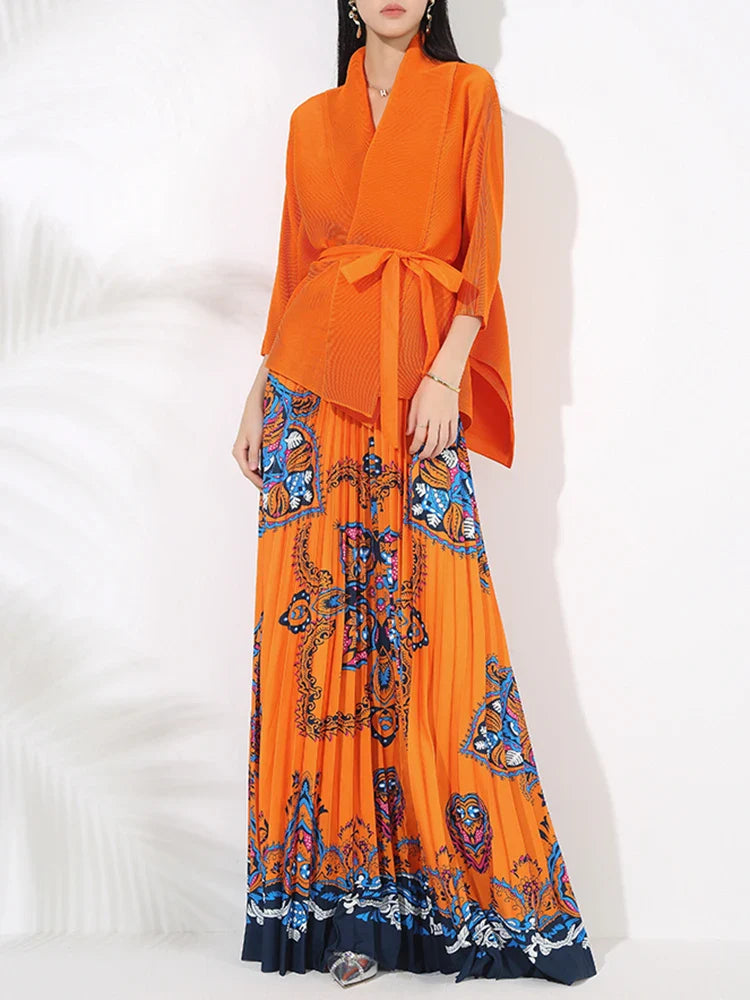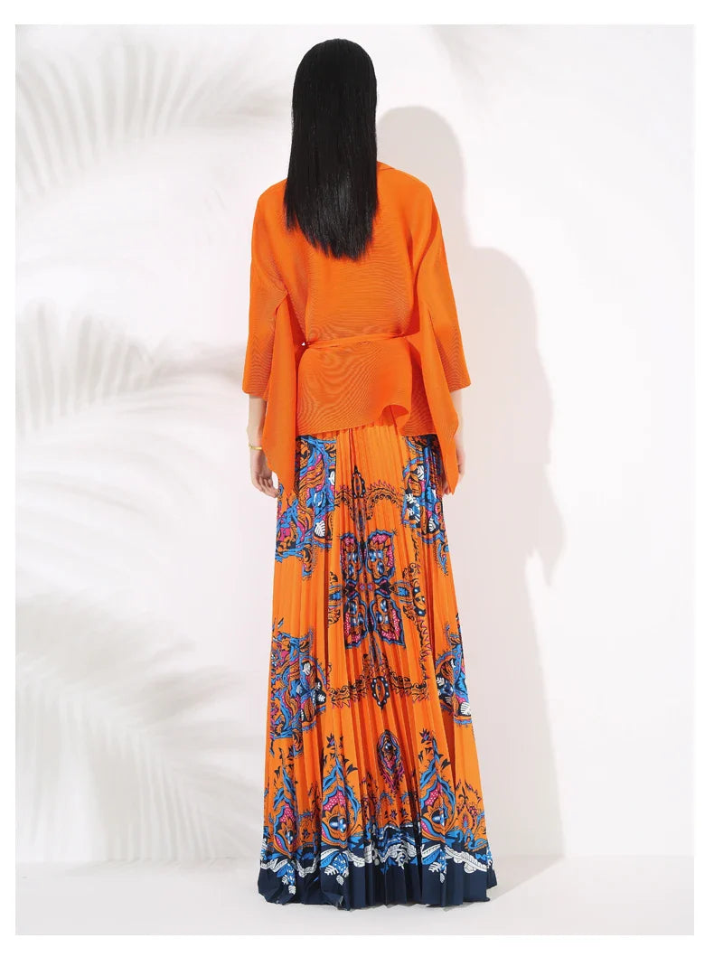 An elegant essential. this pleated set blends sophisticated style with everyday ease. The batwing-sleeve cardigan adds a relaxed yet polished touch. while the maxi skirt. adorned with graceful floral prints. exudes femininity.