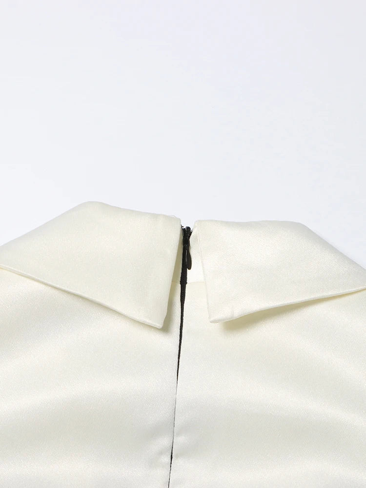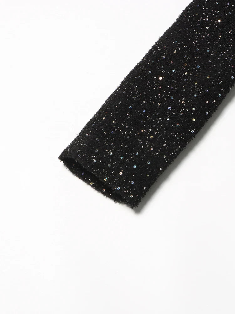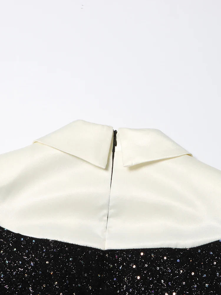 This tuxedo-inspired mini dress combines sleek sophistication with bold style.