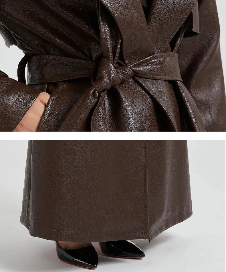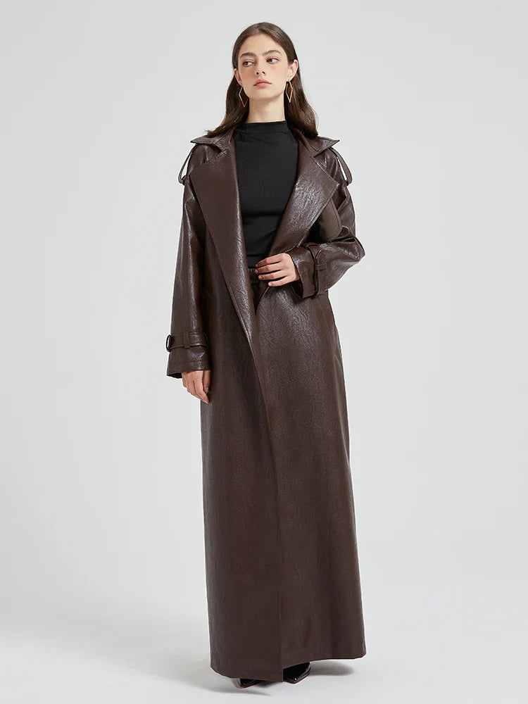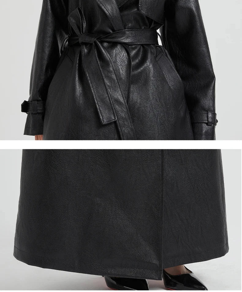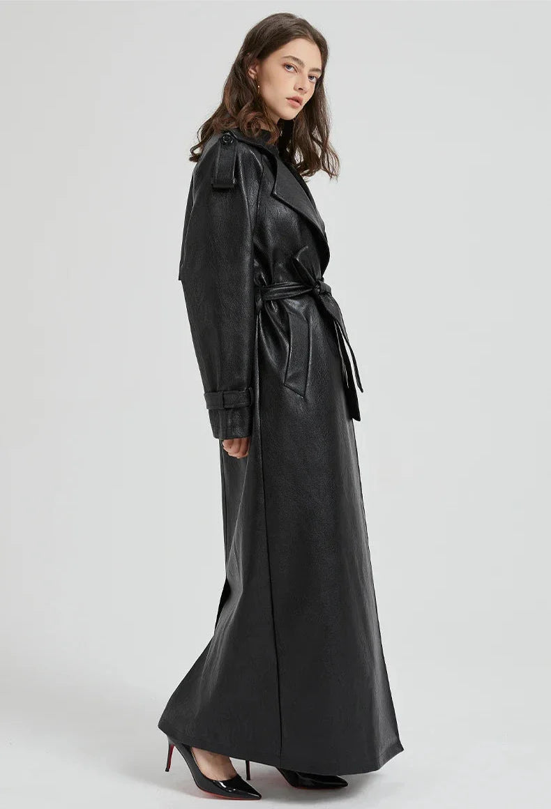 For the woman who dares to stand out. This ultra-long faux leather trench coat offers a striking silhouette. delivering both warmth and a fierce look perfect for any occasion.