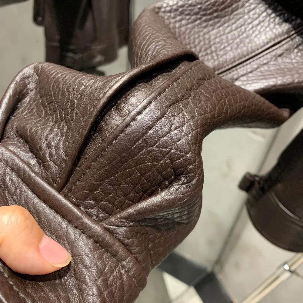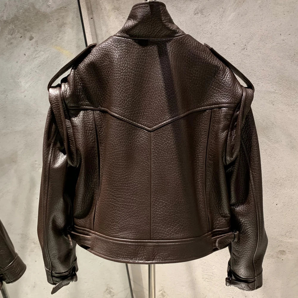 An everyday essential. this cropped leather jacket combines luxurious comfort with timeless style. The genuine sheepskin leather offers a rich grained texture. while the cropped length elongates the body. creating a flattering silhouette.